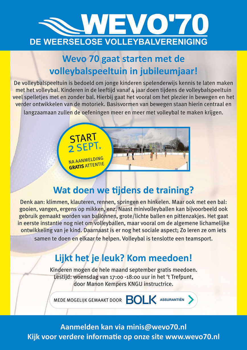 Meer info en aanmelden via vbalspeeltuin@wevo70.nl of minis@wevo70.nl